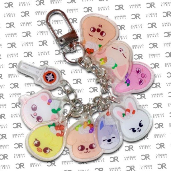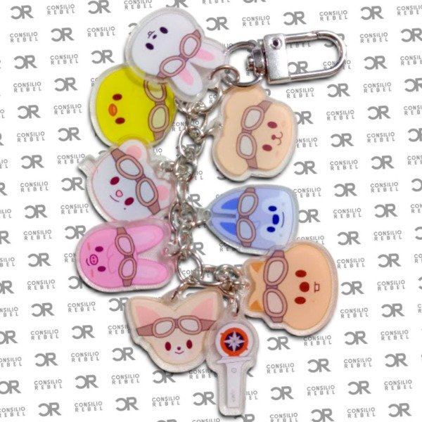 9 piezas de acrílico con los rostros de los SKZOO, con un mosquetón de metal